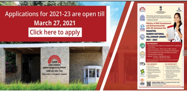 After the success of the pilot cohort, the Ministry of Skill Development and Entrepreneurship has now invited applications for the Mahatma Gandhi National Fellowship (MGNF) 2021-23 in collaboration with nine IIMs. The nine IIMs are IIM Ahmedabad, IIM Bangalore, IIM Jammu, IIM Kozhikode, IIM Lucknow, IIM Nagpur, IIM Ranchi, IIM Udaipur and IIM Visakhapatnam.