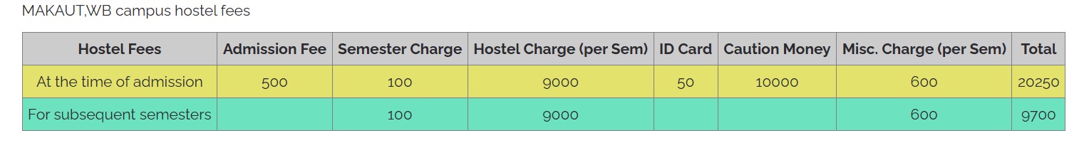 - 12:21 PM IST• 9 Jun 2025Hostels Available at MAKAUT: Check out the Fee StructureStudents from outside the city, can opt for hostel facilities at the MAKAUT campus. The university provides hostels for both boys and girls. Students have to pay some amount at the time of admission for booking. Below is the hostel fee breakup: