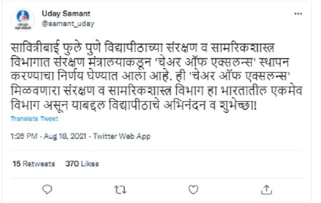 Uday Samant while announcing the development on his Twitter handle said: “The Ministry Of Defence has decided to set up a 'Chair of Excellence' in the Department of Defence and Strategic Studies of Savitribai Phule Pune University. The Department of Defense and Strategic Studies is the only department in India to get this 'Chair of Excellence'. Congratulations and best wishes from the University!”