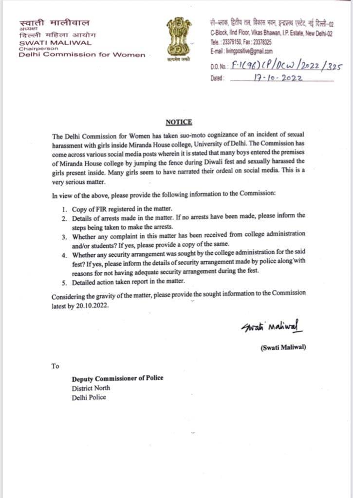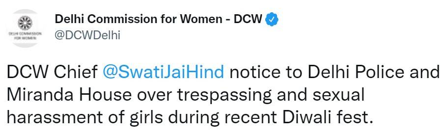 Questioning the security arrangements and management in the college during the event, DCW chief Swati Maliwal posted a long tweet through her official Twitter handle. "Men are climbing walls to forcibly enter Diwali fest at Miranda House, one of the most popular colleges of Delhi. The women have made serious allegations of molestation and harassment. We are sending notices to Delhi Police and the college administration. How did this hooliganism happen? What were the security arrangements in place?" she said in a tweet in Hindi.