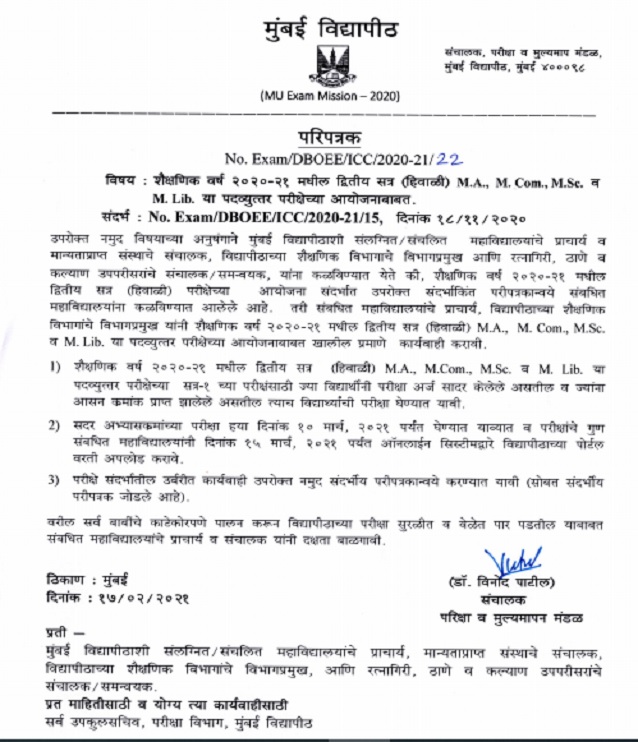 Mumbai University Exams 2021: The University of Mumbai has released the new circular for Mumbai University Exams 2021. As per the circular, the colleges have now been directed to conduct the first year exams for MCom, MA and MSc courses by March 30. Earlier, the varsity has asked the colleges to complete it by March 10 and announce result for Mumbai University Exams 2021 on March 15, 2021.
