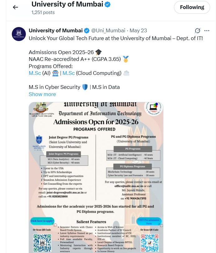 Take a look below at the latest Mumbai University tweet regarding these newly launched programs: