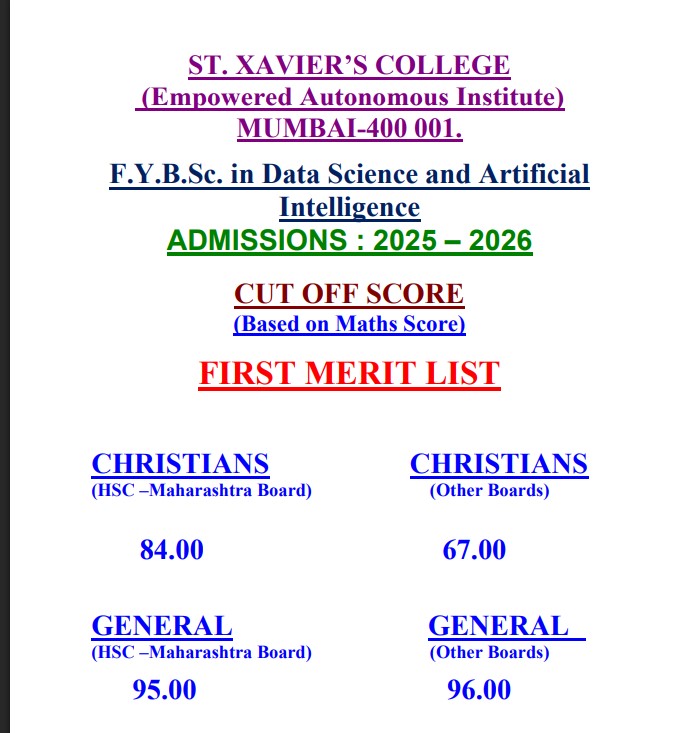 The Mumbai University First Merit List 2025 has been officially released on the websites of MU affiliated colleges. Featured below is a snapshot of St. Xavier’s College’s First Merit List 2025, showcasing the cut-off marks and eligible candidates for various courses.
