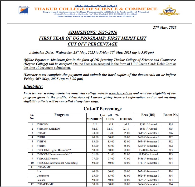 The University of Mumbai has released the First Merit List for Undergraduate Admissions 2025. Several popular affiliated colleges have now declared their first round of cut-offs.