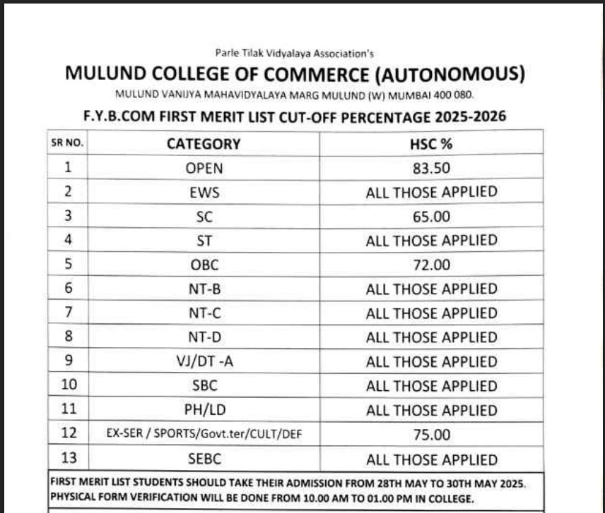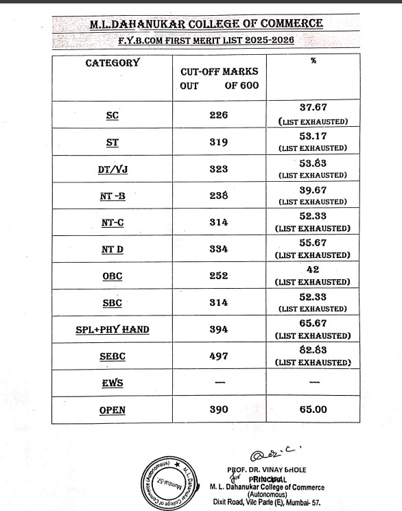 Mumbai University ML Dahanukar College of Commerce Announced First Merit List 2025