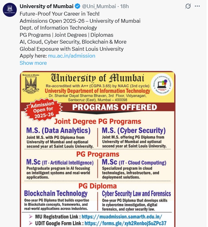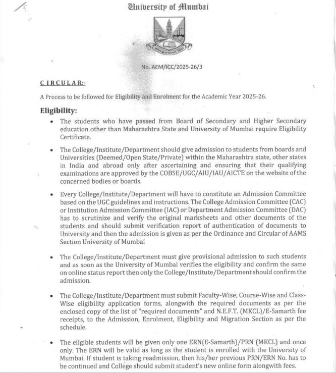For the 2025-26 academic session, Mumbai University has updated its admission eligibility guidelines. As per the latest rules, students applying from outside Maharashtra must now secure an Eligibility Certificate to be considered for admission. The official notification outlining the detailed criteria can be found on the university’s website.