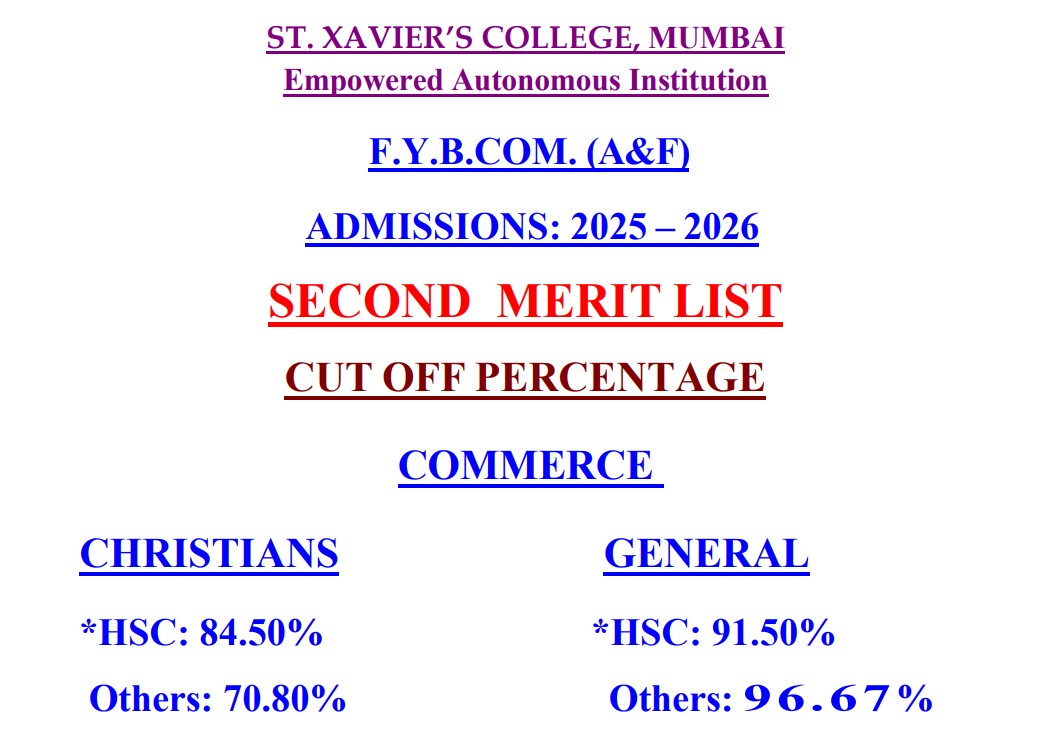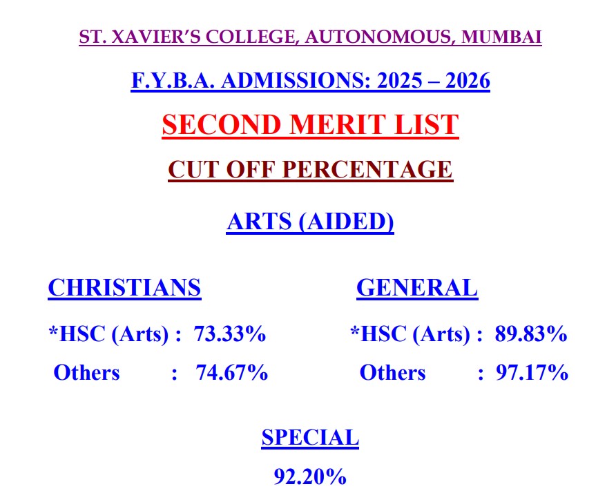 The University of Mumbai has published the second merit list for the 2025 admissions cycle. As part of the announcement, St. Xavier’s College has also shared its updated cut-off for the First Year BA program. Check the St Xavier's College FYBCom cutoff and admission details below: