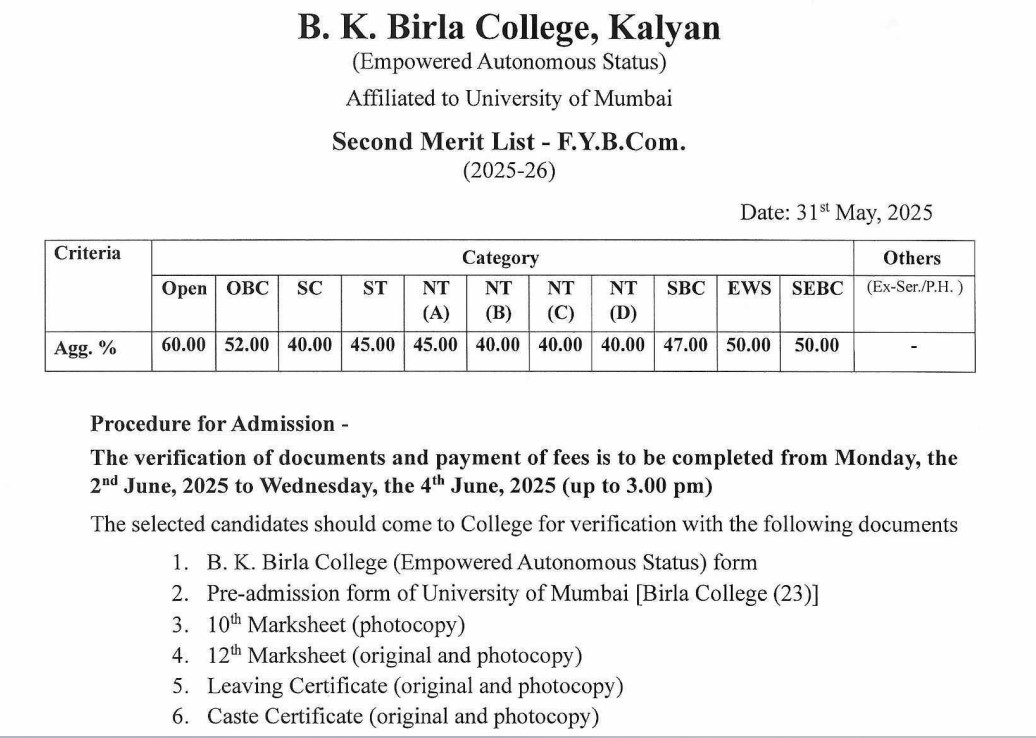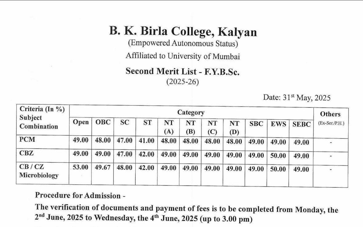 The University of Mumbai has officially released the second merit list for 2025 admissions. Students can now check the updated cut-off scores on the websites of top colleges. Below is the snapshot of the FYBSc second merit list from BK Birla College: