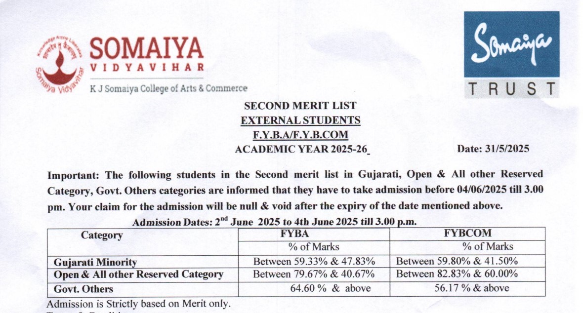 K J Somaiya College of Arts and Commerce has released its Second Merit List for 2025 for the BA and BCom courses for external applicants. The list includes course-wise and category-wise cut-offs. Below are the latest admission cut-off details for the FYBA and FYBCom programs at the college: