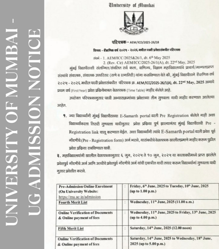 To secure seats at Mumbai University, selected applicants must complete document verification and pay the admission fees between June 6 and June 10, 2025 (by 3 PM). Missing the deadline may lead to the cancellation of admission.