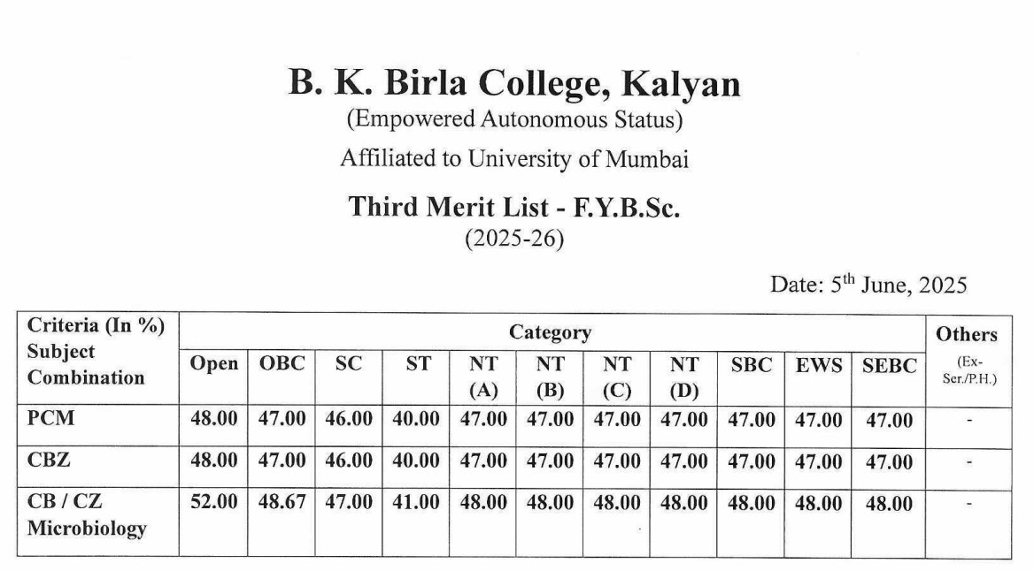 Below is a snapshot of BK Birla College’s 3rd Merit List for the FYBSc course: