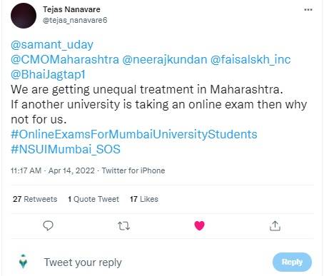 #onlineexamsformumbaiuniversitystudents has been trending on social media platforms for some time now. One of the student wrote, @samant_uday @CMOMaharashtra @neerajkundan @faisalskh_inc @BhaiJagtap1 We are getting unequal treatment in Maharashtra. If another university is taking an online exam then why not for us. #OnlineExamsForMumbaiUniversityStudents #NSUIMumbai_SOS