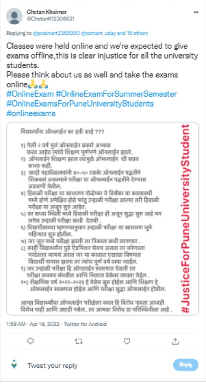Urging the authority one of the student tweeted, Classes were held online and we're expected to give exams offline,this is clear injustice for all the university students. Please think about us as well and take the exams online, #OnlineExam #OnlineExamForSummerSemester #OnlineExamsForPuneUniversityStudents #onlineexams