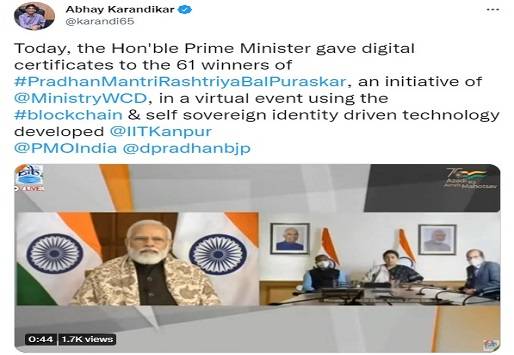 Prime Minister Narendra Modi distributed digital certificates among 61 winners of Pradhan Mantri Rashtriya Bal Puraskar 2021 and 2022 using a blockchain and self-sovereign identity-driven technology developed by CRUBN, an IIT Kanpur incubated company, under the National Blockchain Project.