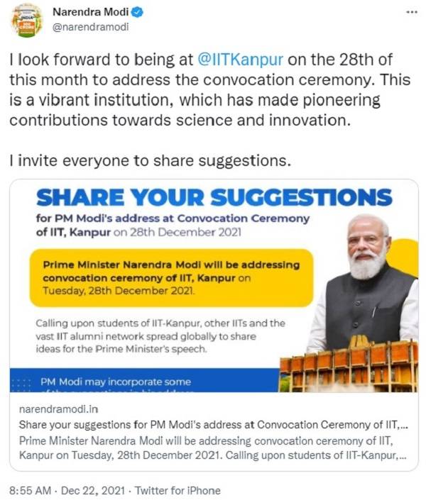 โI look forward to being at @IITKanpur on the 28th of this month to address the convocation ceremony. This is a vibrant institution, which has pioneering contribution towards science and innovation. I invite everyone to share suggestions,โ Prime Minister Narendra Modi tweeted.