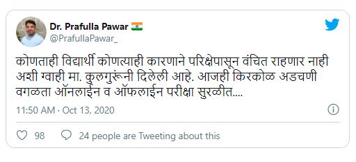 In response to this, Pune University Registrar, Dr. Prafulla Pawar also sent out a tweet assuring students that anyone facing technical problems will be given another chance to appear for the exam. He wrote, “No student will be deprived of the examination for any reason. Given by the Vice-Chancellor. Even today, online and offline exams are smooth except for minor problems.”