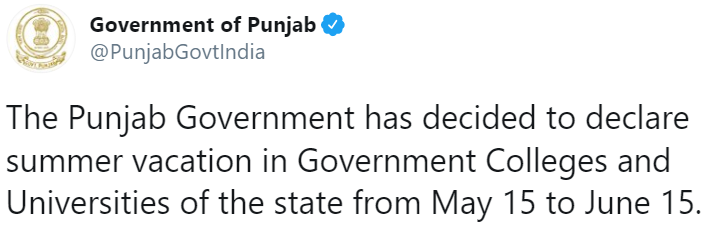 A tweet posted by the Punjab government declaring the vacations reads, “The Punjab Government has decided to declare summer vacation in Government Colleges and Universities of the state from May 15 to June 15."