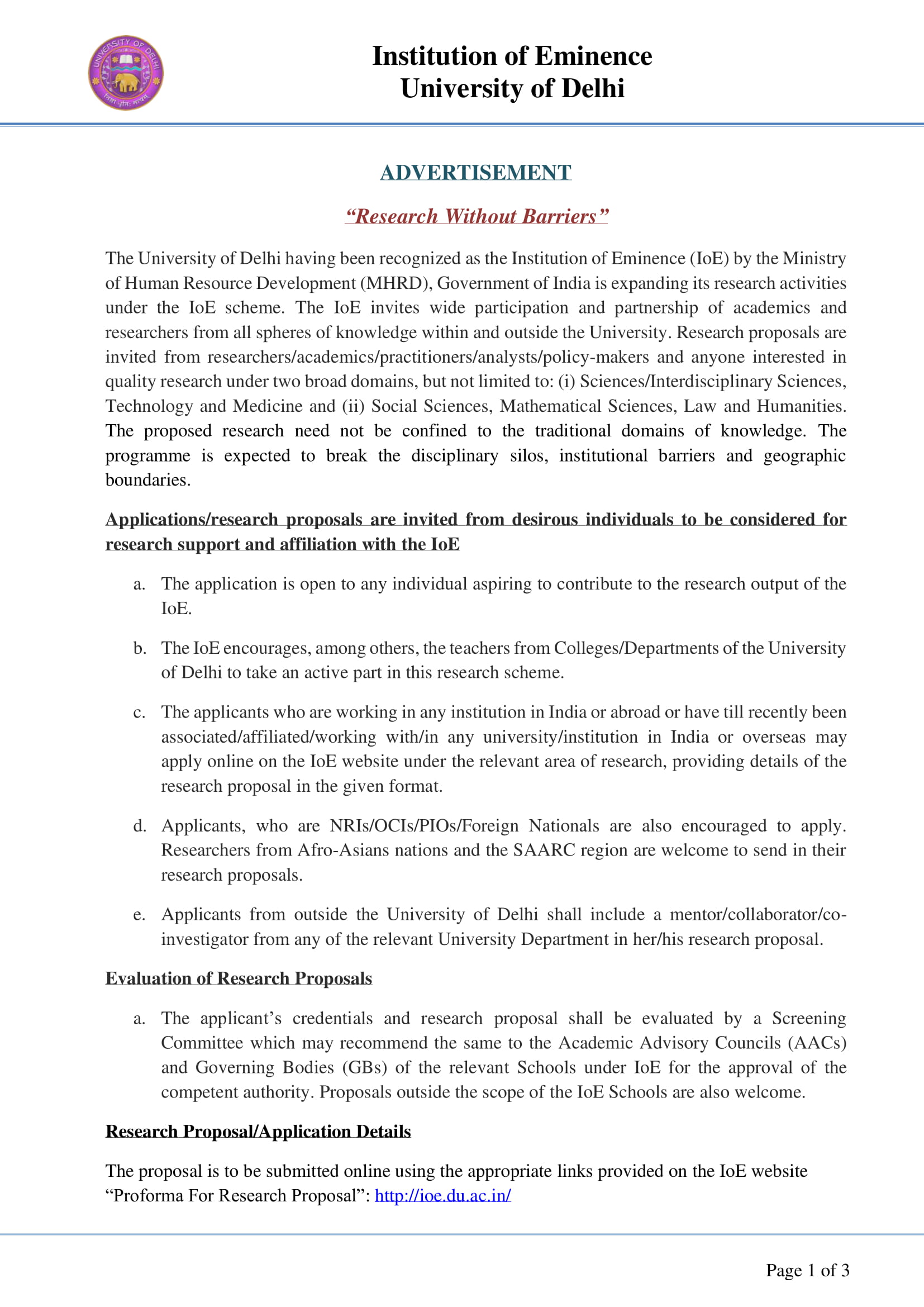 It is also expected that the initiative will boost the university’s national and global rankings. Through the advertisement, DU also invited worldwide participation and partnership of academics, researchers, practitioners and others from any sphere of knowledge, under this initiative. Interested researches can submit the research proposal online on the university’s website: http://ioe.du.ac.in/. As there is no timeline to submit the research proposal, candidates can submit their proposals whenever they wish to. The submission window will remain open.