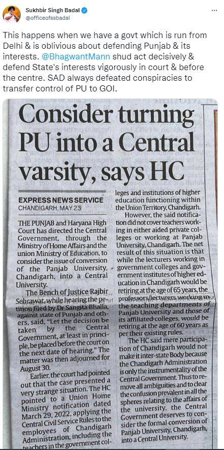In May 2022, the Centre received directions from the Punjab and Haryana High Court through the Ministry of Home Affairs and the Ministry of Education, to consider the issue of conversion of Panjab University into a Central university.