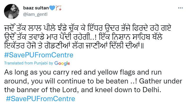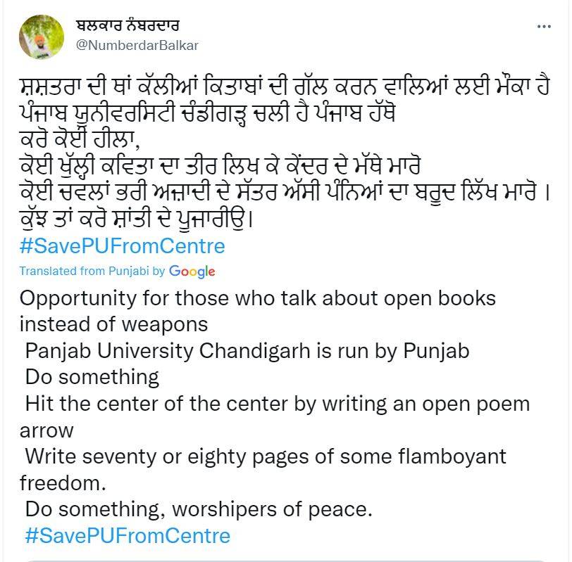"Opportunity for those who talk about open books instead of weapons Panjab University Chandigarh is run by Punjab Do something Hit the center of the center by writing an open poem arrow Write seventy or eighty pages of some flamboyant freedom. Do something, worshipers of peace. #SavePUFromCentre"