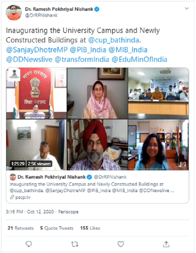 Union Education Minister Ramesh Pokhriyal Nishank has inaugurated the new campus and newly constructed buildings of the Central University of Punjab, Bathinda virtually. The inauguration was done in the presence of the Lok Sabha MP Harsdimrat Kaur Badal. The ten new buildings and the University Insignia Monument, dedicated to 'Jai Jawan, Jai Kisan, Jai Vigyan and Jai Anusandhan', at the CUPB new campus have been built at the cost of Rs 203.78 crore.