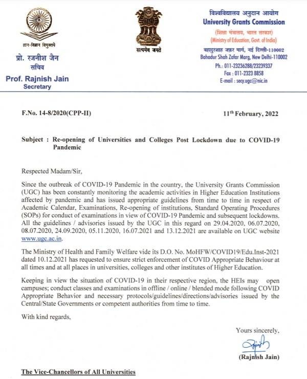 The University Grants Commission (UGC) has issued a circular allowing all colleges and universities to reopen campuses for offline classes and examinations following COVID-19 guidelines. The commission, which is the higher education regulatory body in India, has directed the higher education institutions (HEIs) to reopen or work in online or blended mode. The order came in the light of the third wave of COVID-19 subsiding across various parts of the country.