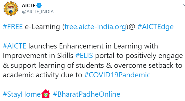 According to the official statement released by the AICTE, in order to prevent academic loss of students, many companies offered their e-learning contents free of cost to learners. To sure that students get online content that not only enhances learning for regular subjects but also aims to build up valuable skill sets as required in the actual work environment, AICTE launched the ELIS portal.