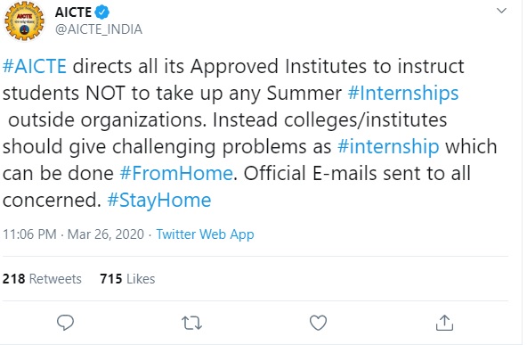 AICTE has asked all its approved institutes to give challenging problems as internship which can be done from home.