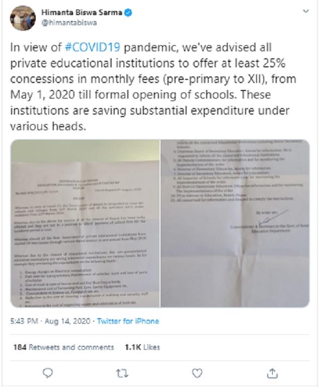 Taking to Twitter, Assam Education Minister Himanta Biswa Sarma, said: “In view of COVID19 pandemic, we've advised all private educational institutions to offer at least 25% concessions in monthly fees (pre-primary to XII), from May 1, 2020 till formal opening of schools. These institutions are saving substantial expenditure under various heads.”
