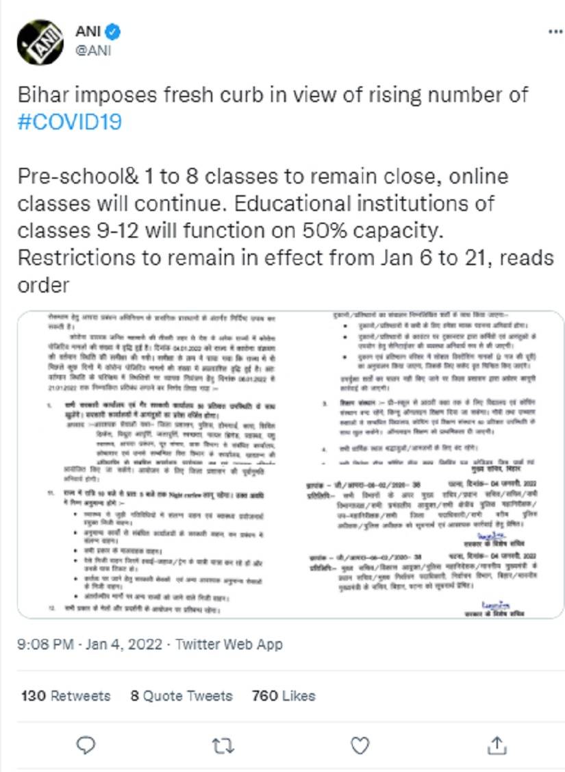 The schools in the state will remain closed until January 21. The Bihar government also announced the state-wide night curfew.
