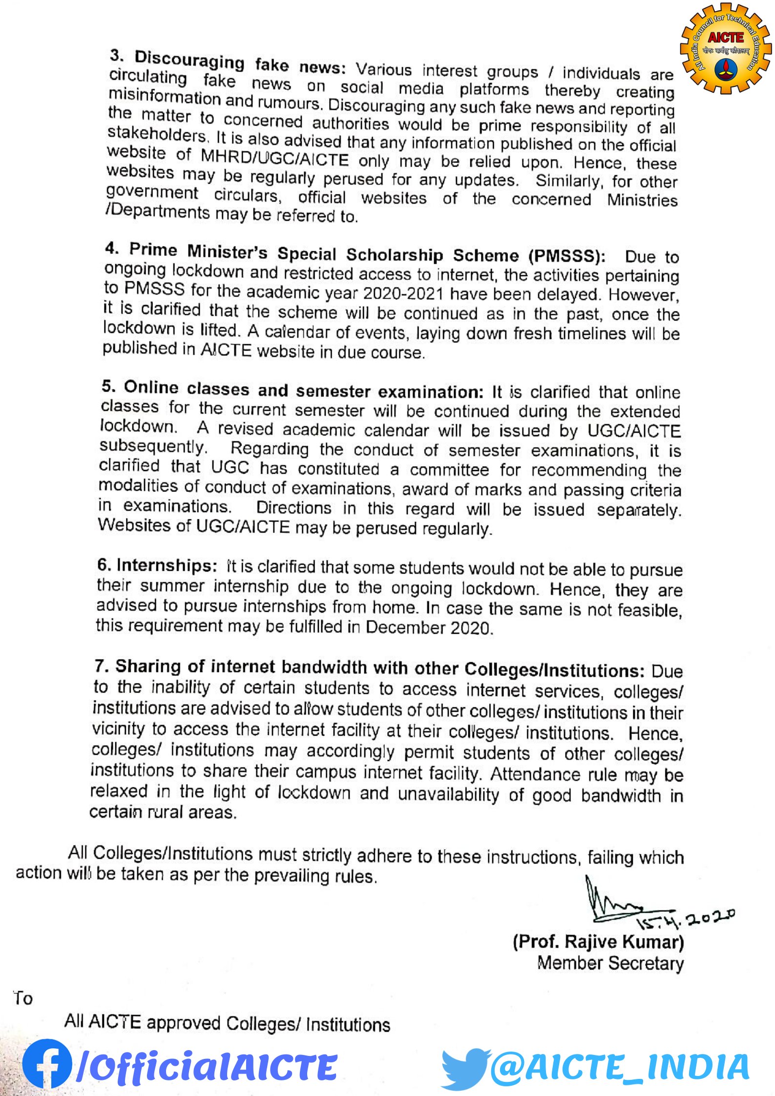 The All India Council for Technical Education (AICTE) directed academic institutions to discourage fake news. The nationwide lockdown due to the outbreak of the novel coronavirus led to postponed examinations, closure of academic institutions, delay in results and more. Such unexpected events gave birth to multiple fake news. Fake public notices regarding the revised exam schedules for postponed exams, result dates, admission dates, and other academic activities started making rounds on the internet.