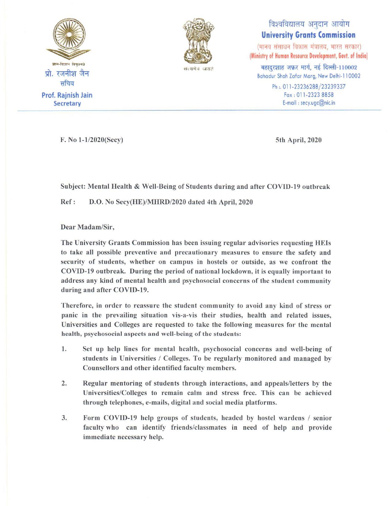 The letter further stated that in order to reassure that students are not going through any kind of stress or panic during this lockdown due to delayed results, postponement of examination, and deferred classes. The universities and colleges may set up mental health helplines for the purpose. The concerned authorities also asked the academic institutions to monitor the helpline regularly and manage the same with the help of counselors and identified faculty members. The commission advised the academic institutions to keep students stress free and ask them to remain calm.