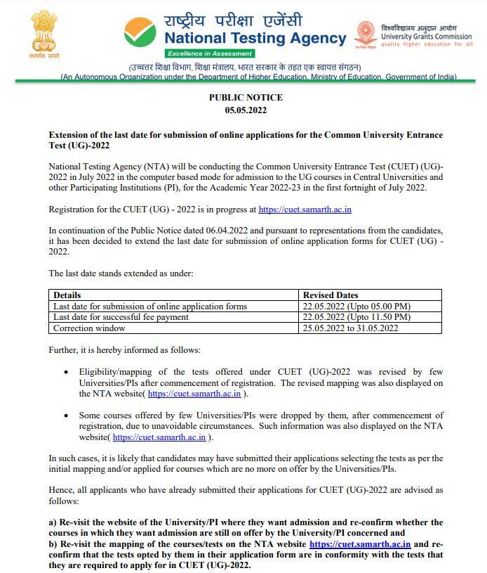 Read the notice released by NTA for CUET 2022 registration extension dated 05-May-2022 - Click here to download