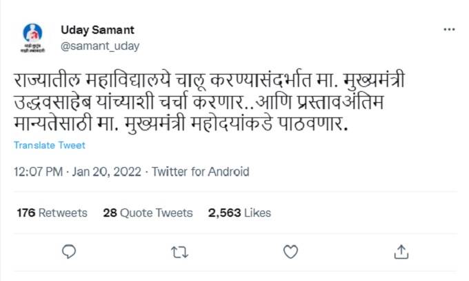Earlier Uday Samant had announced the closure of colleges till February 15, 2022, in the state. However, with the low case of hospitalization, many have been asking for the educational institutions to be reopened.