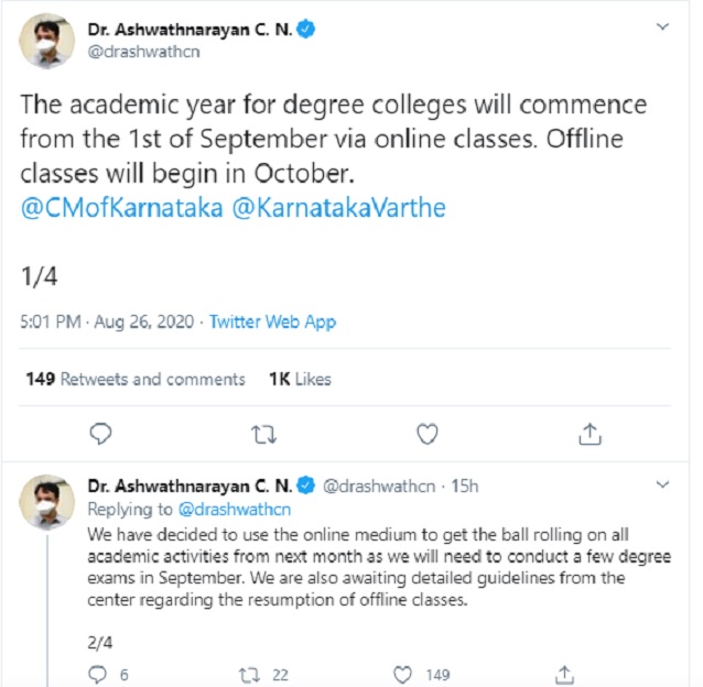 “We have decided to use the online medium to get the ball rolling on all academic activities from next month as we will need to conduct a few degree exams in September,” Mr Ashwathnarayan, who also holds the Higher Education portfolio, tweeted.