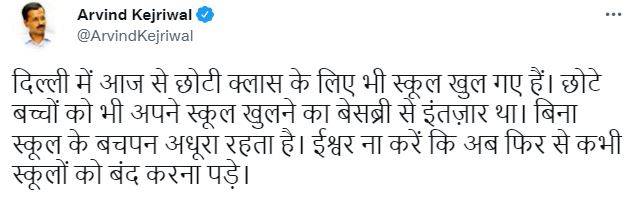 Delhi School Reopening: The National Capital has reopened schools for students from nursery to Class 8 on Monday, February 14, 2022, in view of the declining COVID -19 cases in the national capital. Welcoming the students, Delhi Chief Minister Arvind Kejriwal through his official Twitter handle said (in Hindi), “Schools have also reopened for primary classes in Delhi from today. Young children were also eagerly waiting for their schools to reopen. Childhood is incomplete without school. God forbid that schools have to be closed ever again.” Check his tweet below: