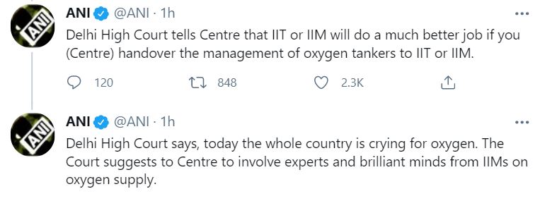 Pointing out that the Supreme Court has said that Delhi must get 700 MT, the Delhi Court added, today the whole country is crying for oxygen. The Court suggests to Centre to involve experts and brilliant minds from IIMs on oxygen supply.