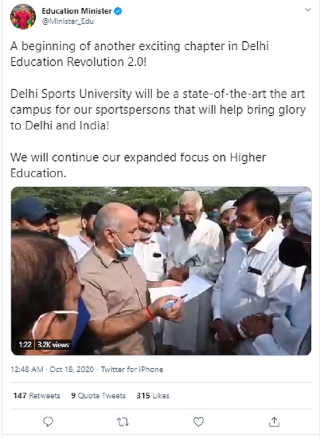 "Delhi Sports University will be a state-of-the-art the art campus for our sportspersons that will help bring glory to Delhi and India!," he tweeted.