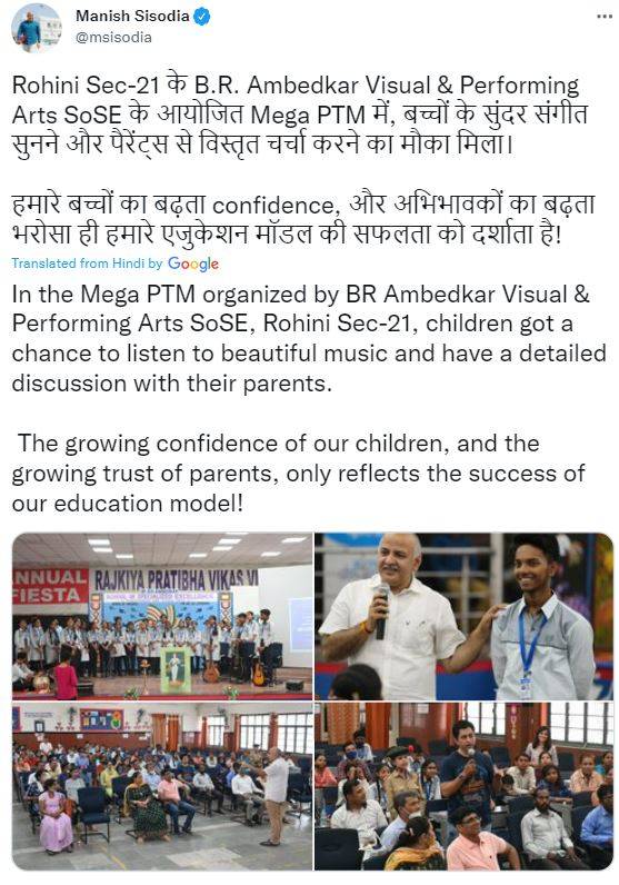 “In the Mega PTM organized by BR Ambedkar Visual & Performing Arts SoSE, Rohini Sec-21, children got a chance to listen to beautiful music and have a detailed discussion with their parents. The growing confidence of our children, and the growing trust of parents, only reflects the success of our education model!” Sisodia said in another tweet.