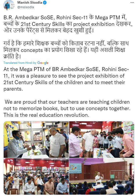 Delhi Deputy Chief Minister Manish Sisodia shared glimpses of the mega PTM conducted at various SoSEs through his official Twitter handle. The minister tweeted, “At the Mega PTM of BR Ambedkar SoSE, Rohini Sec-11, it was a pleasure to see the project exhibition of 21st Century Skills of the children and to meet their parents. We are proud that our teachers are teaching children not to memorize books, but to use concepts together. This is the real education revolution.”