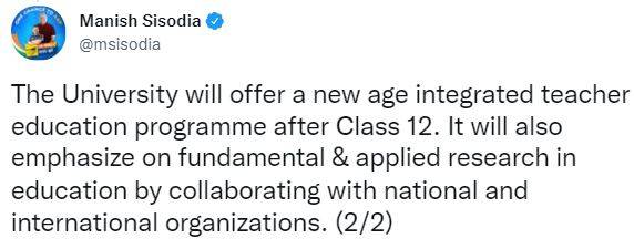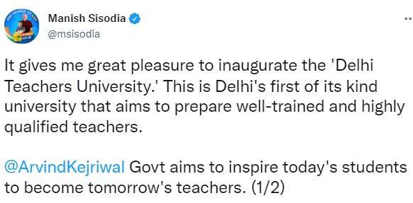 While inaugurating the university, Manish Sisodia said, “It gives me great pleasure to inaugurate the 'Delhi Teachers University.' This is Delhi's first of its kind university that aims to prepare well-trained and highly qualified teachers. Arvind Kejriwal-led Govt aims to inspire today's students to become tomorrow's teachers.” “The University will offer a new age integrated teacher education programme after Class 12. It will also emphasize on fundamental and applied research in education by collaborating with national and international organizations,” the minister added.