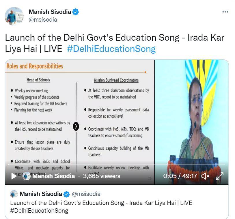 The minister tweeted, “A person gives important 20 years of his life to education. But what do we want by giving 20 years of long education? What is our intention? What do the child, parents, society and nation want from education? Answering these questions, Delhi Education Geet is being released today.”