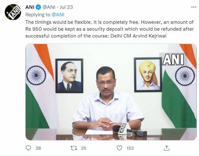 "The timings would be flexible. It is completely free. However, an amount of Rs 950 would be kept as a security deposit which would be refunded after successful completion of the course," Kejriwal added.