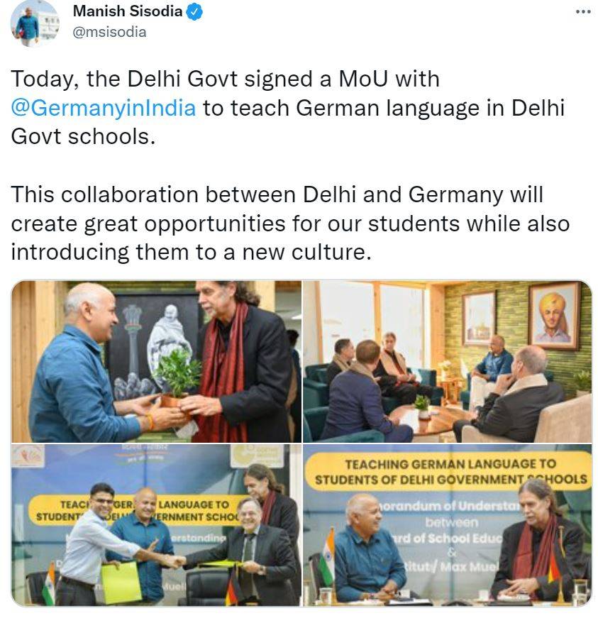 The tweet posted from the official account of the Delhi Deputy Chief Minister Manish Sisodia states, “Today, the Delhi Govt signed a MoU with @GermanyinIndia to teach the German language in Delhi Govt schools. This collaboration between Delhi and Germany will create great opportunities for our students while also introducing them to a new culture.”