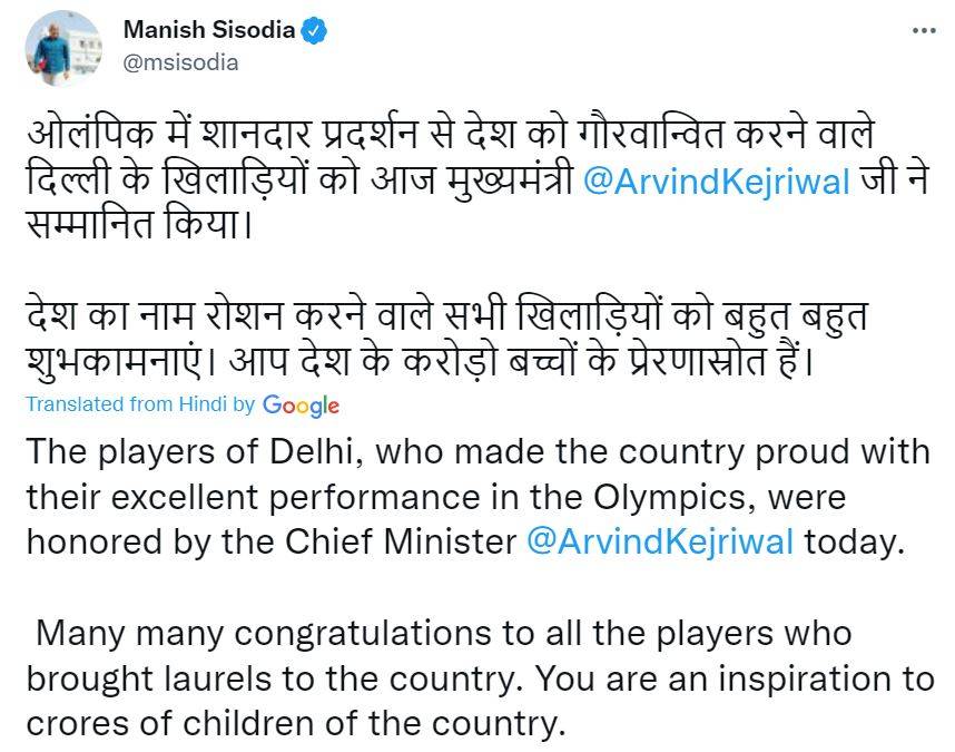 Meanwhile, the government of Delhi also organized a felicitation ceremony to honor the players of Delhi, who made the country proud with their excellent performance in the Olympics. Delhi Deputy CM in his tweet said, “The players of Delhi, who made the country proud with their excellent performance in the Olympics, were honored by the Chief Minister @ArvindKejriwal today. Many many congratulations to all the players who brought laurels to the country. You are an inspiration to crores of children of the country.