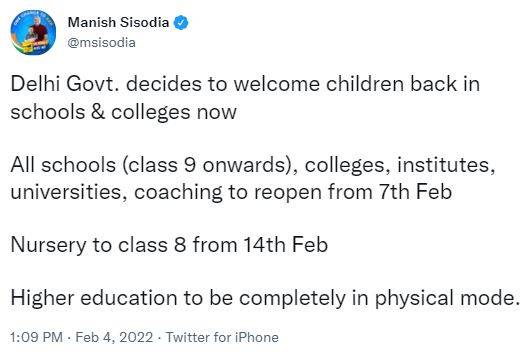 Announcing, Delhi school, college reopening, Delhi Deputy CM Manish Sisodia tweeted, "Delhi Govt. decides to welcome children back in schools & colleges now All schools (class 9 onwards), colleges, institutes, universities, coaching to reopen from 7th Feb Nursery to class 8 from 14th Feb Higher education to be completely in physical mode."