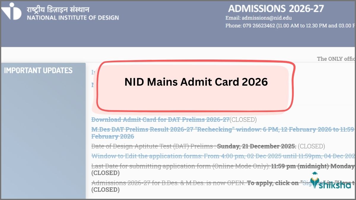 NID Mains Admit Card 2026 has been released now, on February 24, 2026, by the National Institute of Design. The Admit card is released only for the shortlisted candidates who have cleared the NID Prelims Exam conducted on December 21, 2025. Candidates can download the admit card from admissions.nid.edu. Email ID and Date of Birth are required to download the Admit card.