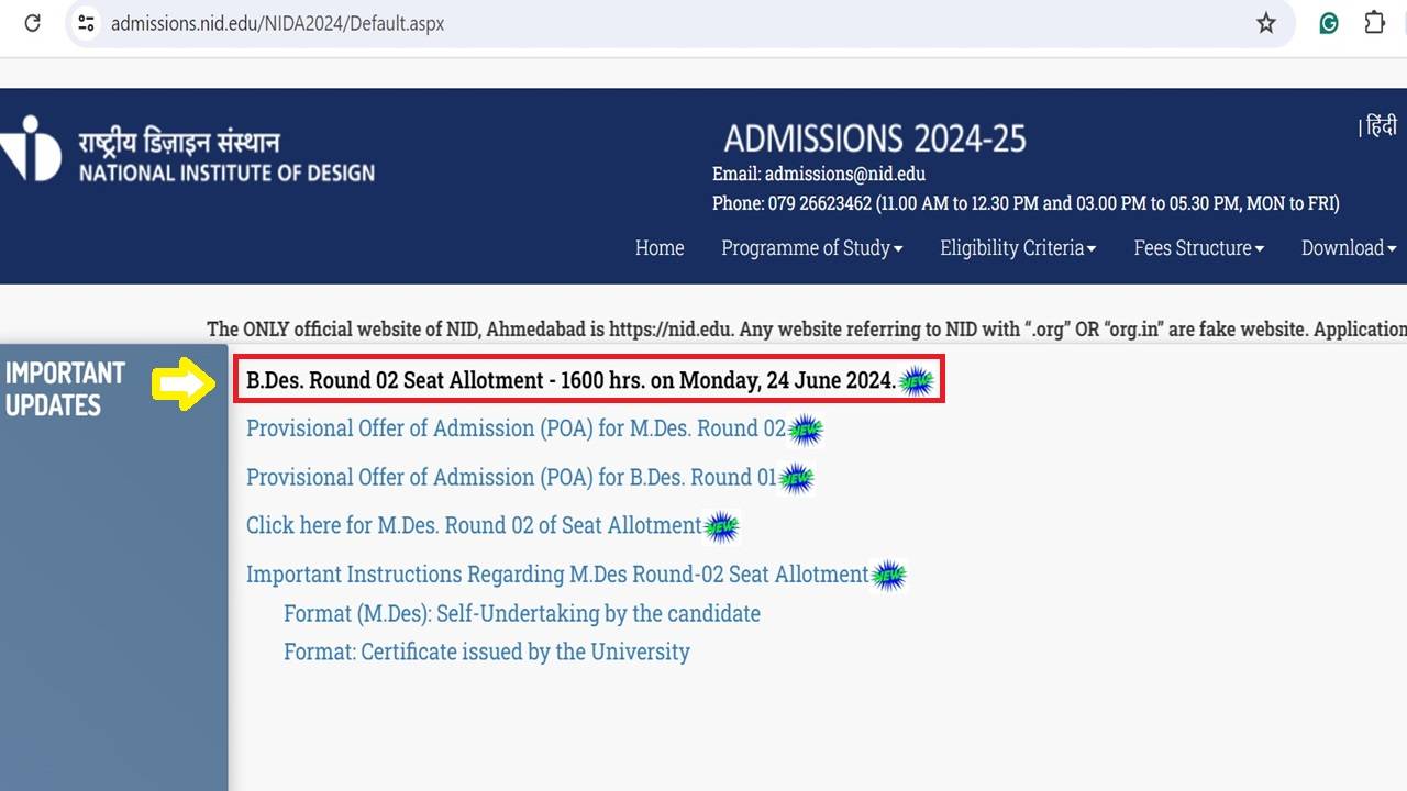 Candidates may check and download the NID B.Des seat allotment round 2 online on June 24. Candidates must note that the direct link to download the NID B.Des seat allotment Round 2 will be available online at admission.nid.edu.