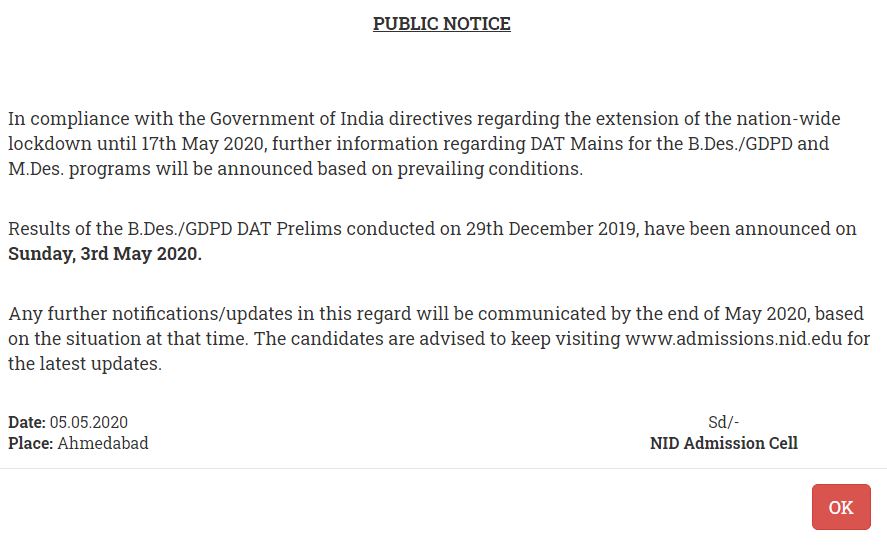 National Institute of Design (NID) has released a notification stating that the admission schedule for all courses will be published in the last week of May 2020. NID DAT 2020 results for BDes/GDPD courses have been declared on May 3. The results for NID DAT MDes prelims were already declared on February 21. Now, the admission schedule mentioning dates of NID DAT 2020 Mains exams and situation test will be announced in the last week of May.