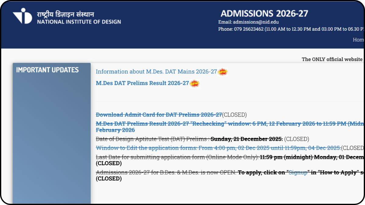 NID Interview for the M.Des programmes will be conducted from March 21, 2026 to April 01, 2026. NID Admit card for Studio test and Interview will be issued on February 24, 2026, at 4 PM.